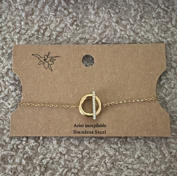 Ce bracelet en acier inoxydable couleur or ajoutera une touche d'élégance à n'importe quelle tenue. Avec un cercle et une barre en strass, il est à la fois chic et raffiné. Fabriqué avec des matériaux de qualité, ce bracelet est durable et résistant pour un usage quotidien.